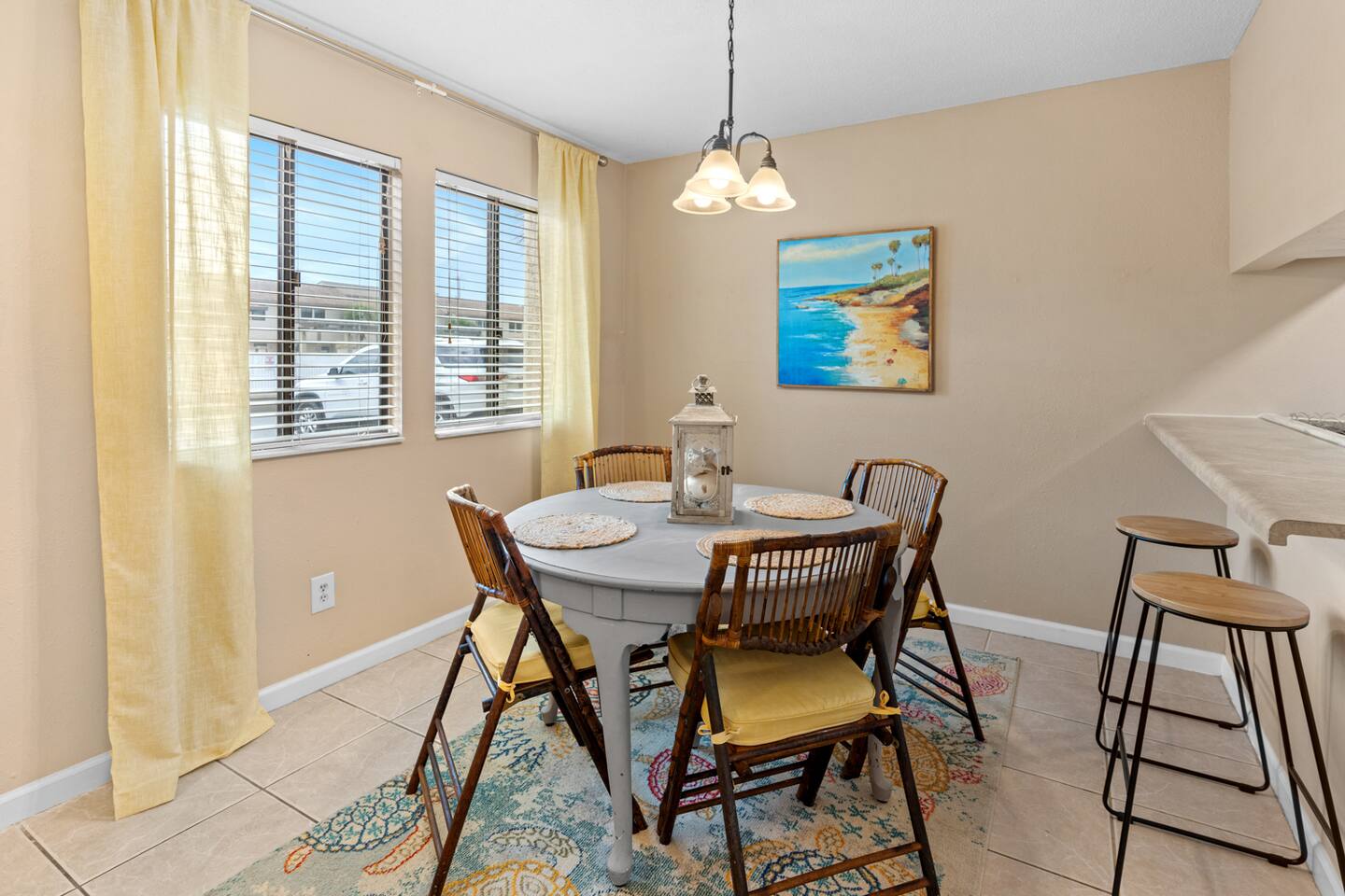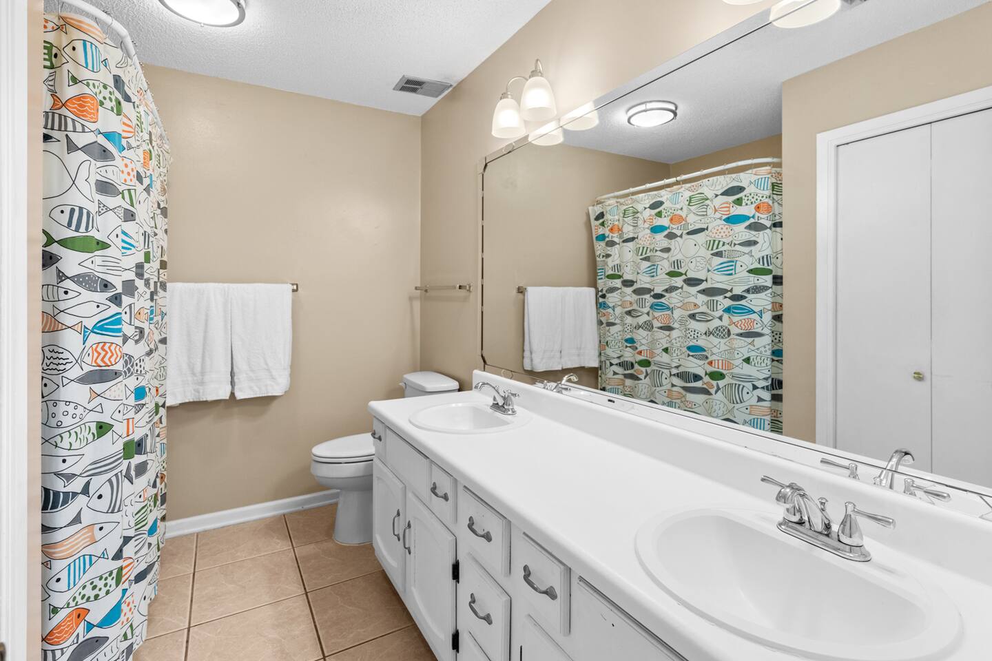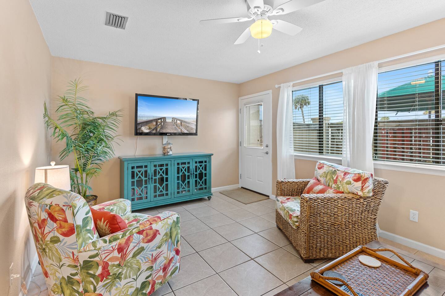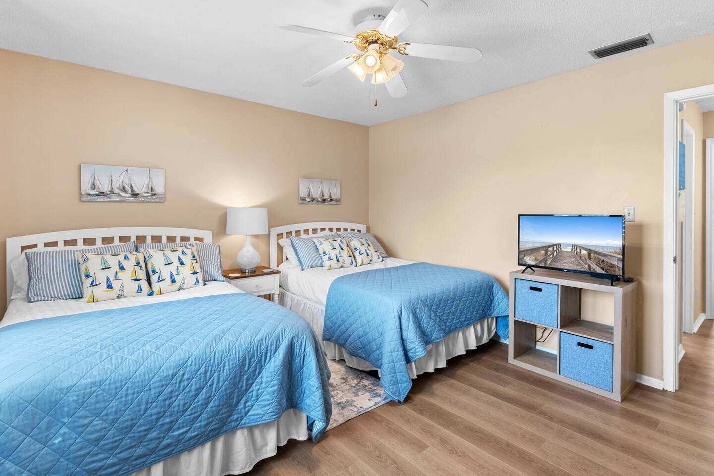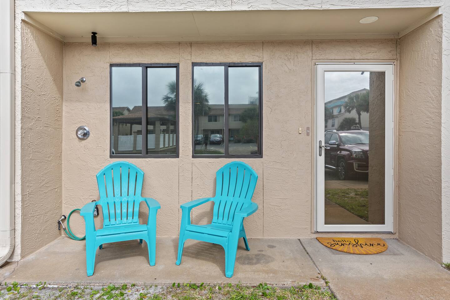 * 2 bedrooms, both upstairs, one with a king bed, and the other with two double beds * Roku TVs in both bedrooms for you to log into your streaming accounts and watch * Large bathroom with double sinks and shower/tub combo upstairs between the bedrooms * Full-sized washer and dryer, iron and ironing board, broom and dustpan, and a hand-held vacuum sweeper * Living room, dining room, kitchen, and half bath located downstairs * Queen size sleeper sofa in living room * Cable TV and comfy seating in the living room * Seating for 4 at the dining room table with additional bar seating * Outdoor dining table and chairs on the back patio * Kitchen stocked with dishes and silverware, stainless steel appliances, blender, waffle maker, slow-cooker, and two coffee makers, so bring along your favorite drip coffee or k-cups * Beach bag and beach towels provided for guests to use when visiting the beach or swimming pool * Beach chairs and umbrella provided for guests to use during their stay * Small supply of laundry detergent, dish detergent, trash bags, toilet paper, and travel-sized shampoo/ conditioner/ body wash and soaps is provided. Please plan to bring or purchase your own toiletries if you need extra. * Other amenities: Fast Wi-Fi, shared complex pool (seasonally heated), outdoor shower for rinsing off after a trip to the beach, and private back patio w/ charcoal grill.